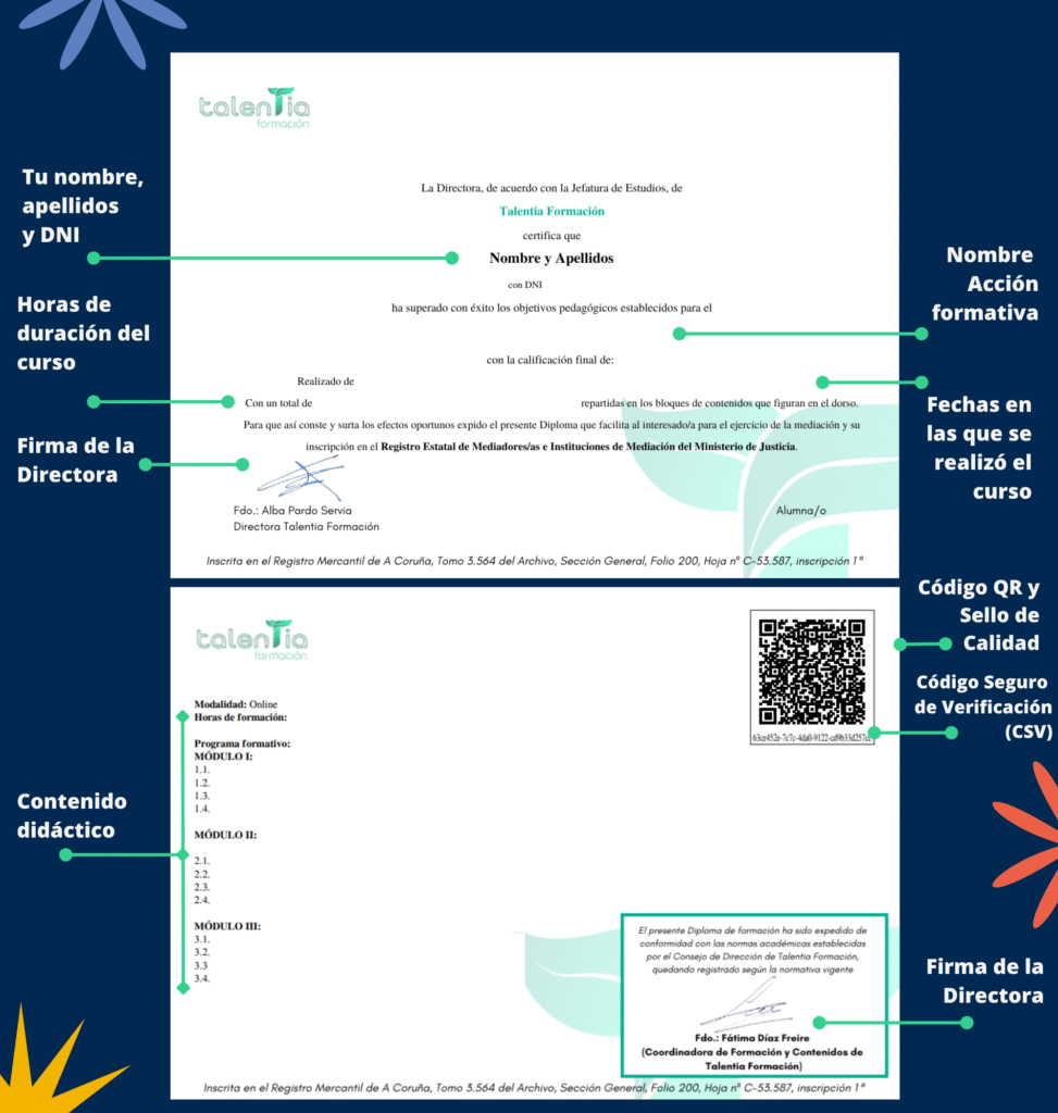 Además de los datos identificativos personales de la alumna/o, este diploma contiene las horas totales dedicadas a esta formación, así como el contenido didáctico del curso en módulos.