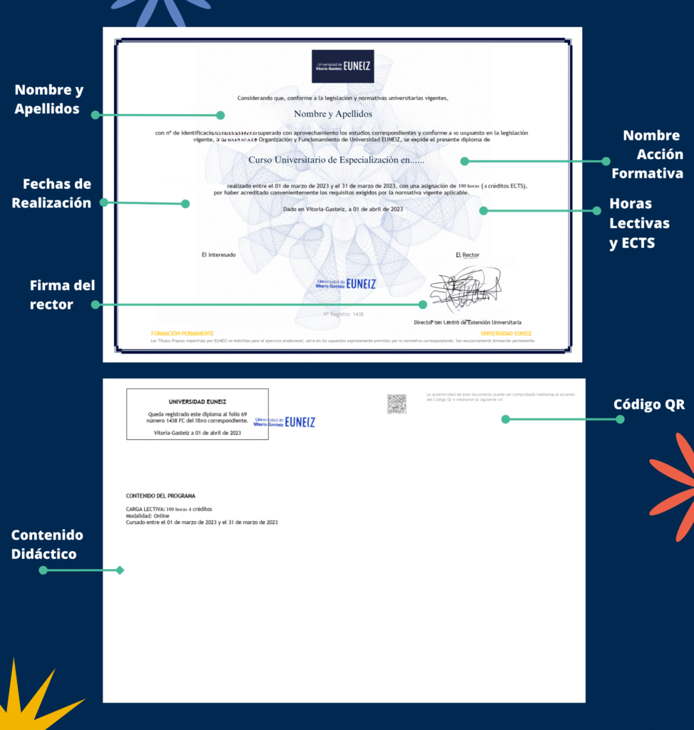 Por último, este certificado con plena validez profesional y curricular contará con un Código Seguro de Verificación -CSV- y un Código QR, acorde al Reglamento Europeo UE 910/2014 utilizado para identificar documentos electrónicos y verificar su autenticidad.